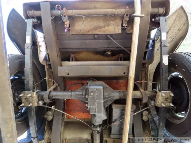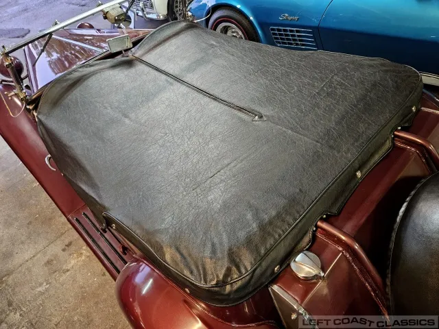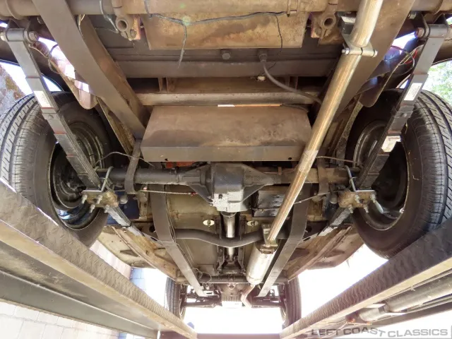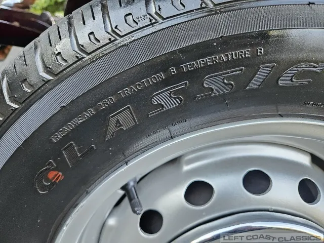 The paint is older, shiny but weathered, with patina and flaws that suit its vintage character. Chrome trim presents well and appears to have been refinished at some point. The original steel wheels have also been refinished, wearing factory hubcaps and Classic Radial LL880 165/80 R15 tires with about 95% tread remaining. The top, side curtains, tonneau, and spare tire cover are all in very good shape.