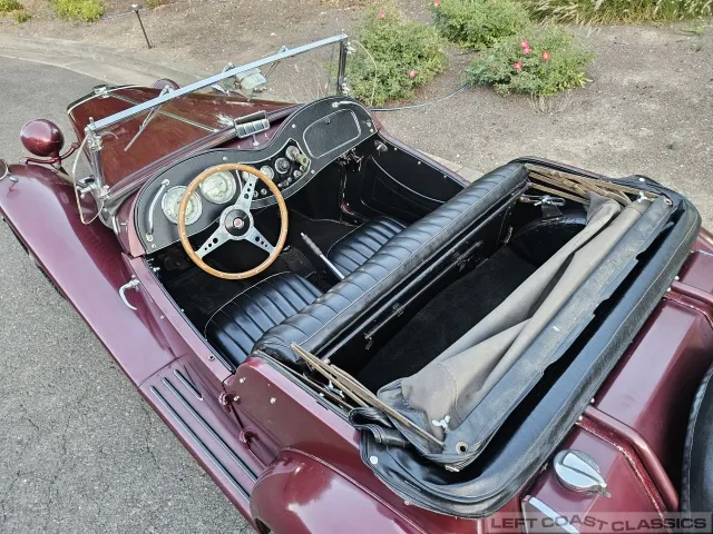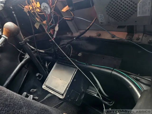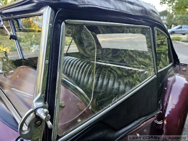 Inside, the gauges are working properly—including the speedometer, odometer, tach, water temp, oil pressure, and amp gauges. All lights and the horn function, and there’s a neatly installed, working solid-state AM radio in the glove box. The interior shows clean and tidy with older materials, good carpeting, and door panels. A wood-rim Moto-Lita steering wheel adds a nice period touch. Like many TDs, the driver’s door needs to be lifted slightly to latch, and the wipers are currently inoperative.