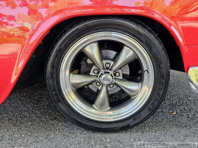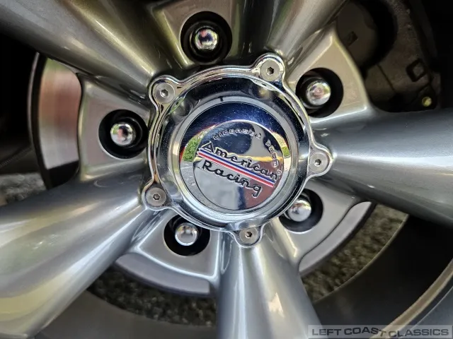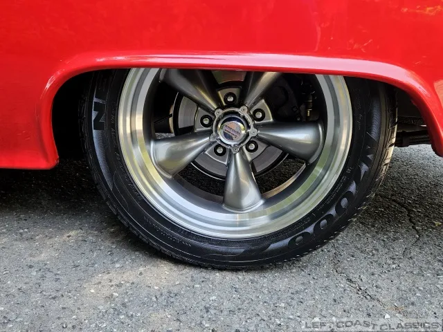 The exterior is finished in Bright Red with a 2-inch front drop and 1-inch rear blocks for a refined stance. It rides on Classic American Racing 5-spoke rims with Nexen N7000 radials (275/40ZR17 rear, 235/45ZR17 front, with 80-90% tread remaining).