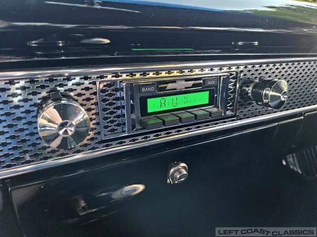 The black interior features low-pile carpeting, cloth seats with front and rear seatbelts, and an Ididit tilt column. Original gauges are bypassed for functional under-dash gauges (amps, oil, temperature—all illuminated) and a Mallory column-mount RPM gauge. It has a Retrosound stereo system with auxiliary input and multiple speakers. All interior components are in good working condition.