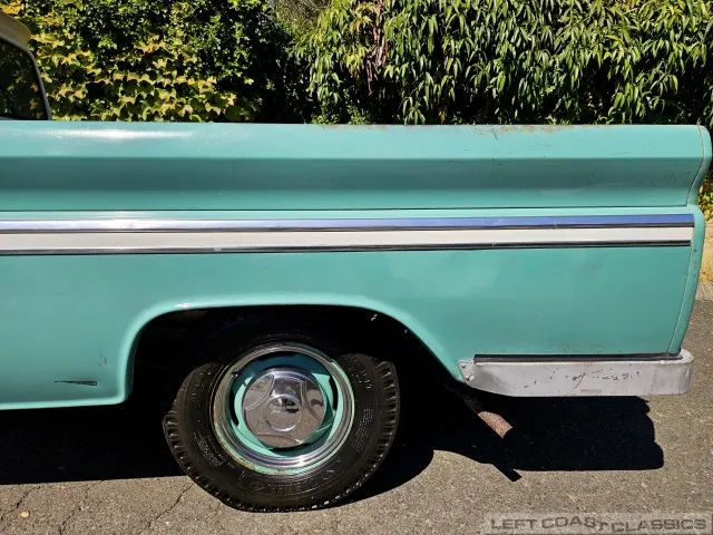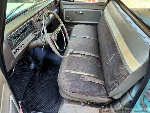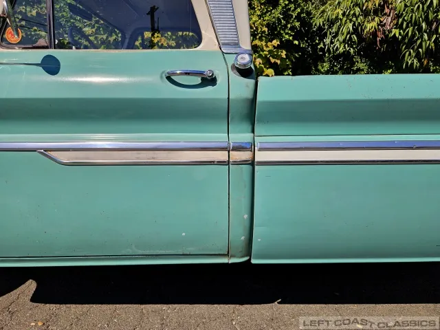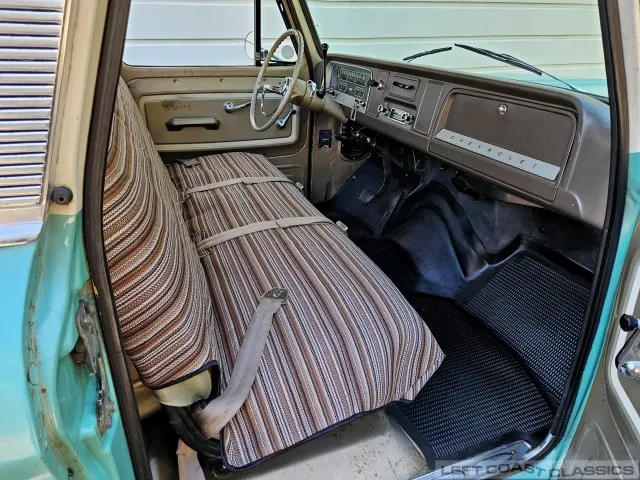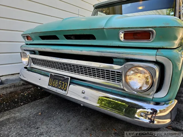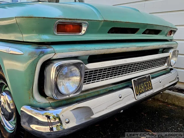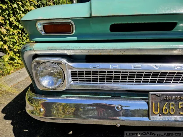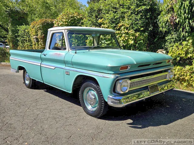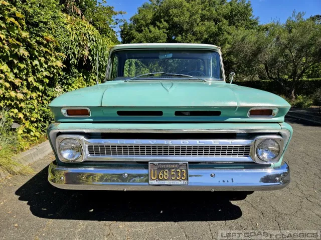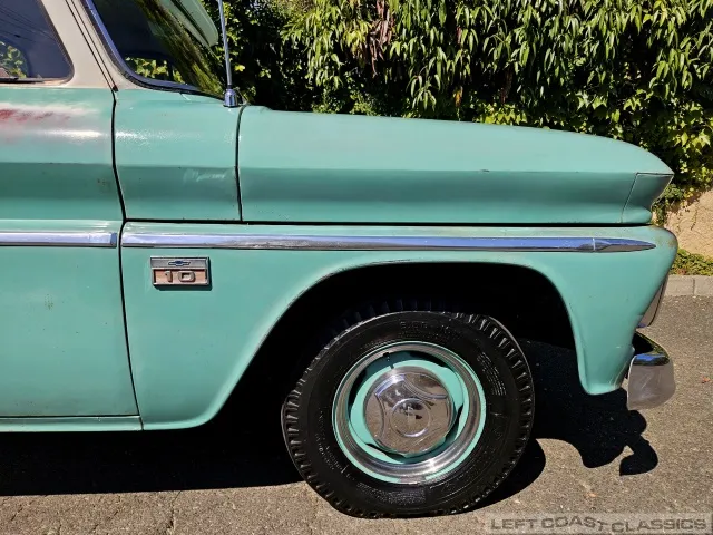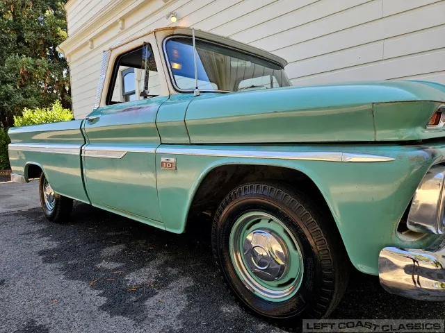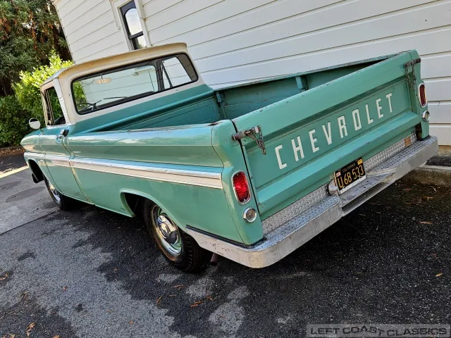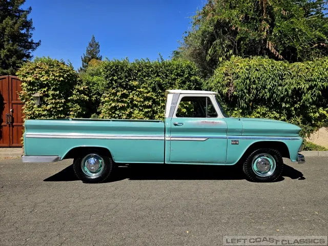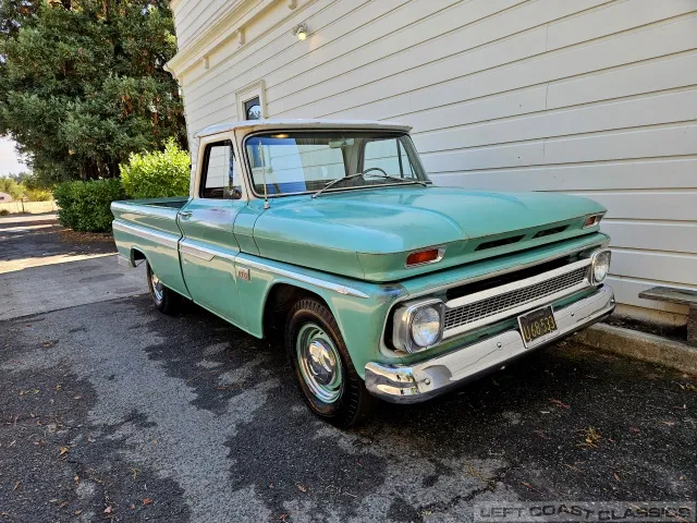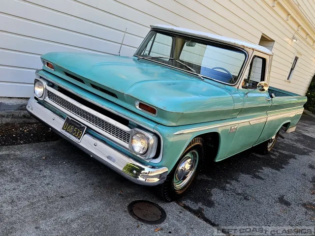 Super original 1966 Chevrolet C10 for sale. This amazing California truck was purchased new on April 30, 1966, at Maggini Chevrolet, Berkeley, California. It remains finished in its original Fathom Turquoise and White, with a well-preserved, all-original Fawn Metallic interior and mostly intact Fawn vinyl upholstery. It includes its original owner’s guide, Protection Plan booklet, data sheet, and Protect-O-Plate.