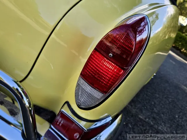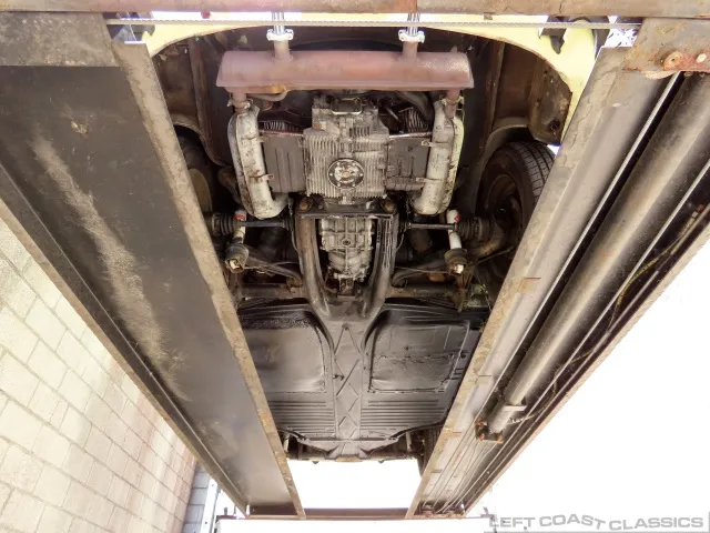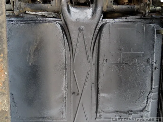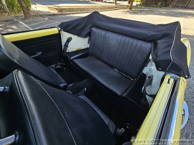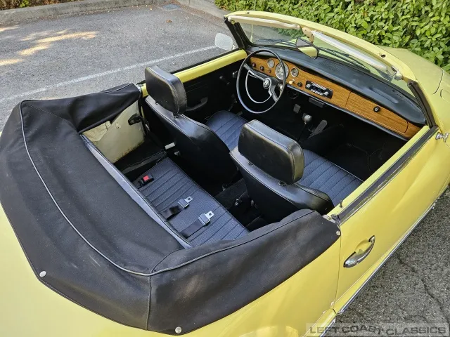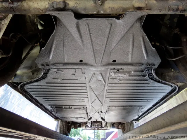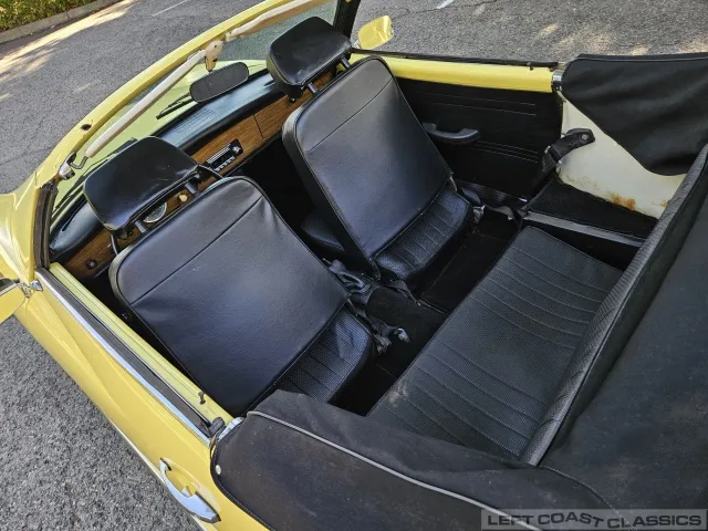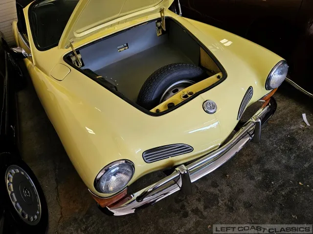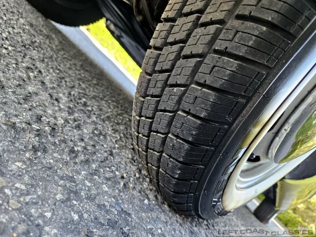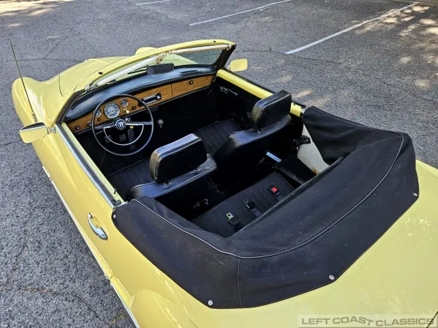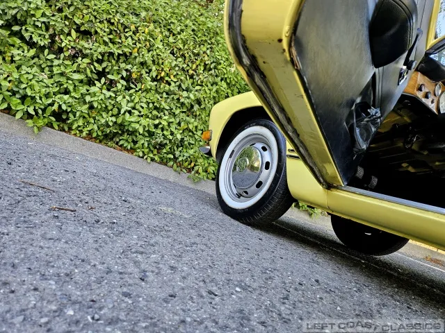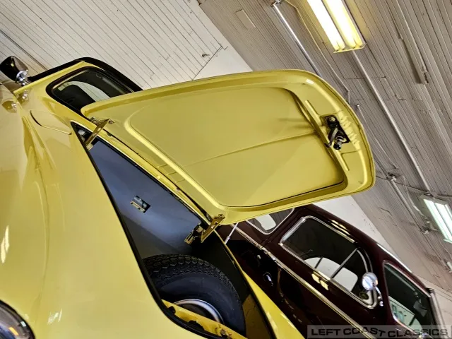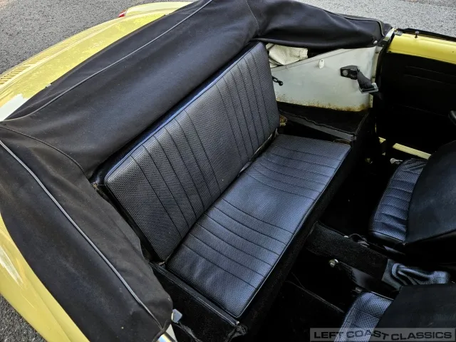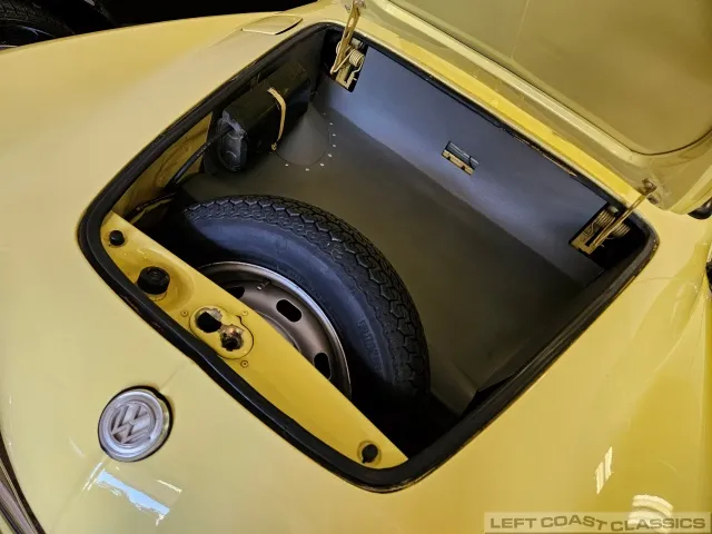 The canvas top, paired with the original headliner, fits well and operates smoothly. It rides on Nexen steel-belted radials with older removable "Porta wall" whitewalls, adding a period-correct look. The undercarriage has been recently refurbished and sealed, though there is very minor degradation at the lower front of the trunk below the spare tire. The trunk is original, equipped with a new liner and spare tire.