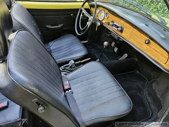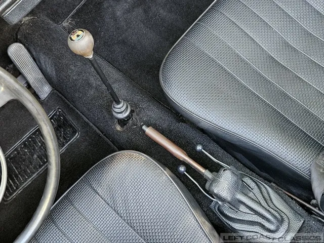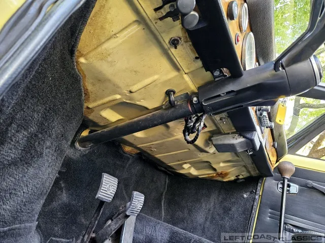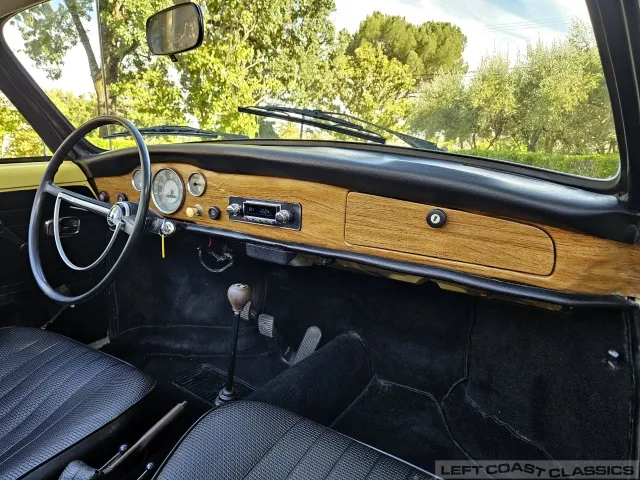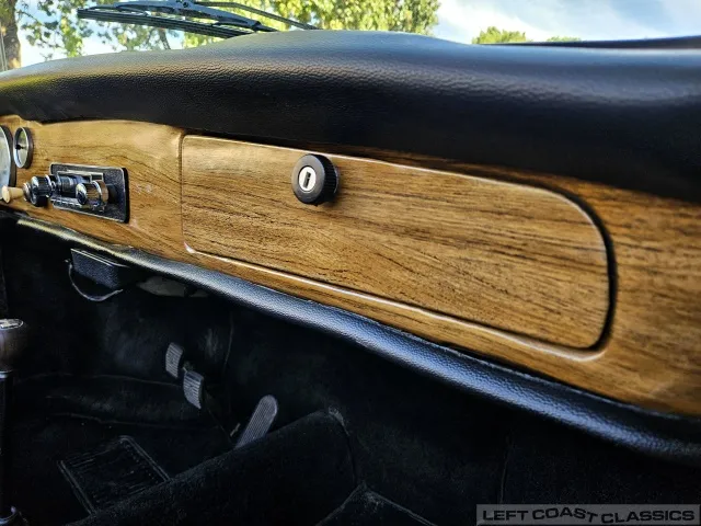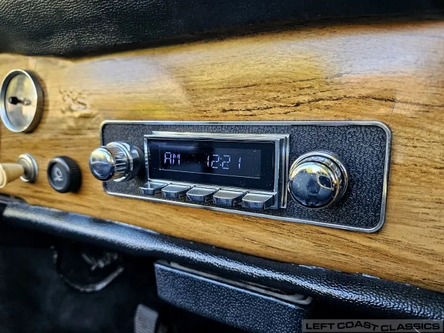 The interior combines original black vinyl with newer carpeting, showing some age but remaining comfortable and presentable. A Hermosa retro radio with Bluetooth and streaming provides modern convenience while maintaining a vintage aesthetic. Gauges and lights function properly, (clock is inoperable), creating a pleasant environment for top-down drives.