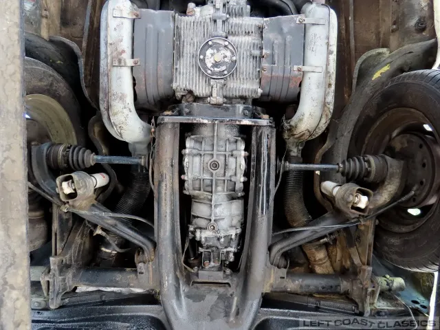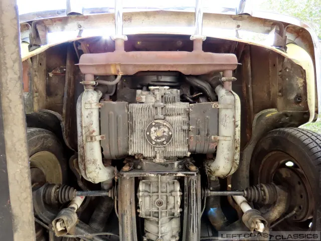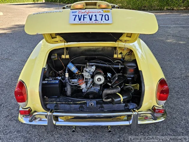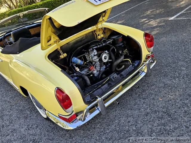 The 4-cylinder air-cooled engine, replaced at some point in the car's history, runs well with compression between 135-145 psi across all cylinders. Recent maintenance includes a full tune-up with new spark plugs, points, fuel filter, valve cover gaskets, vacuum hoses, battery, and oil change. The 4-speed manual transmission shifts smoothly, and the brakes are in good condition, with 75% life remaining at the rear and 65%+ at the front. The car starts easily and handles with the characteristic Karmann Ghia charm.