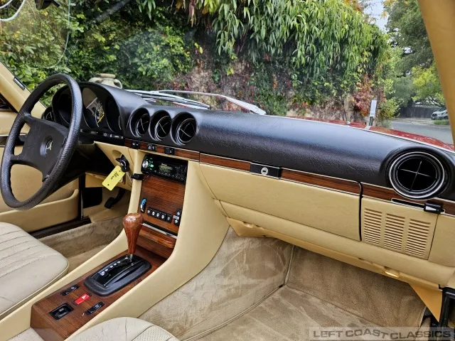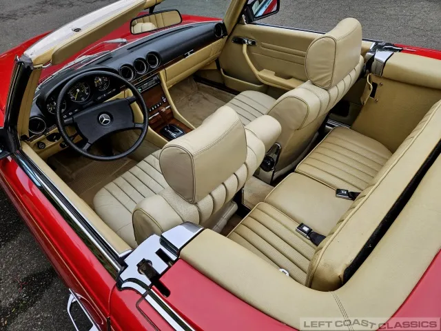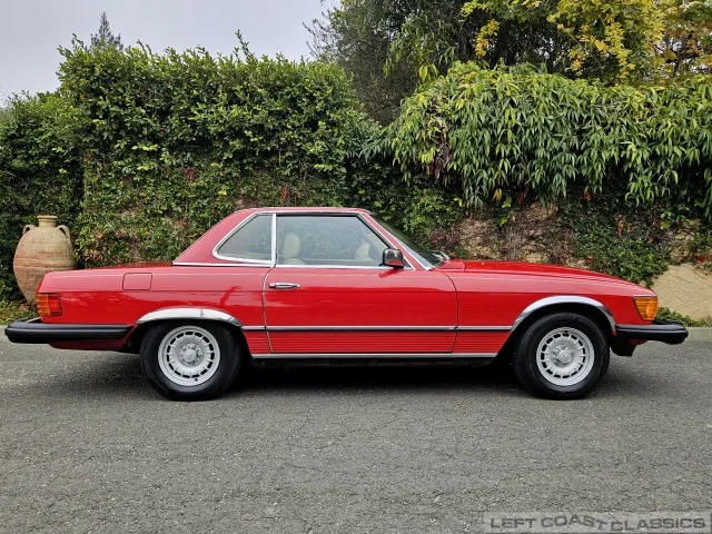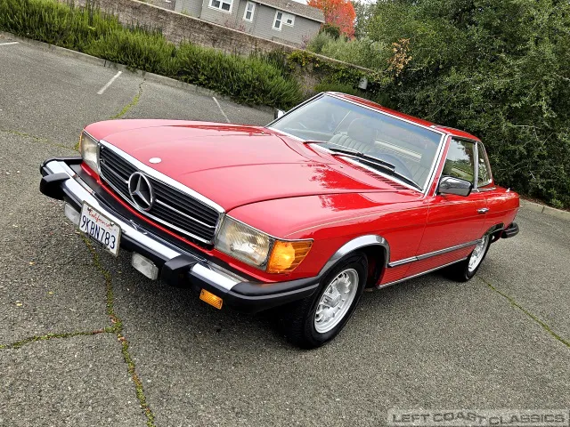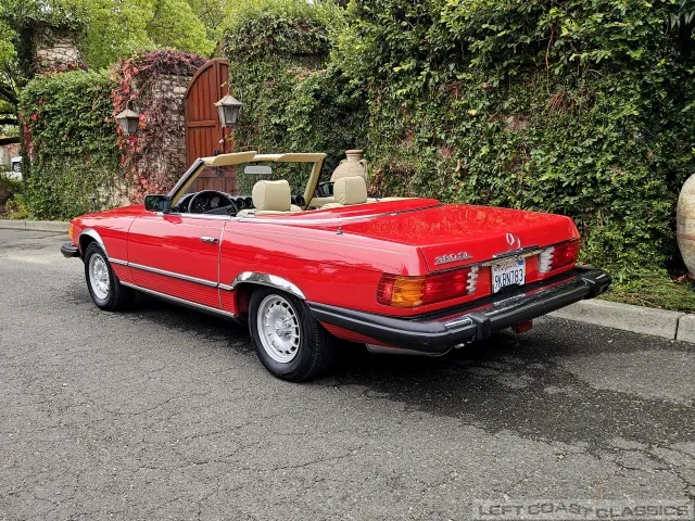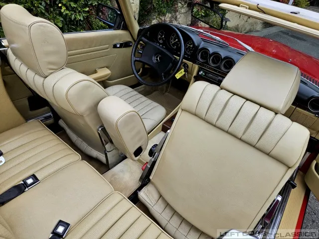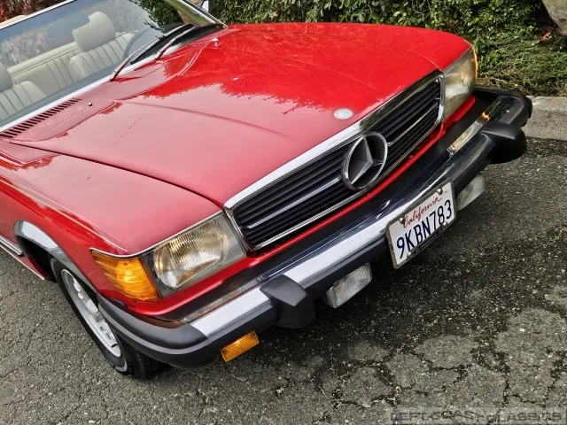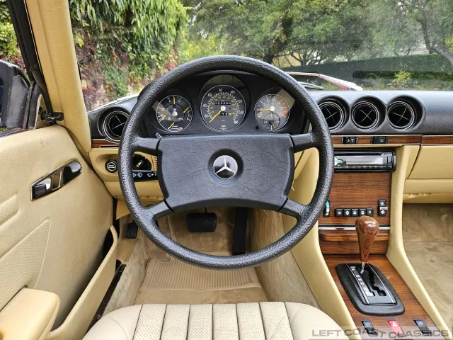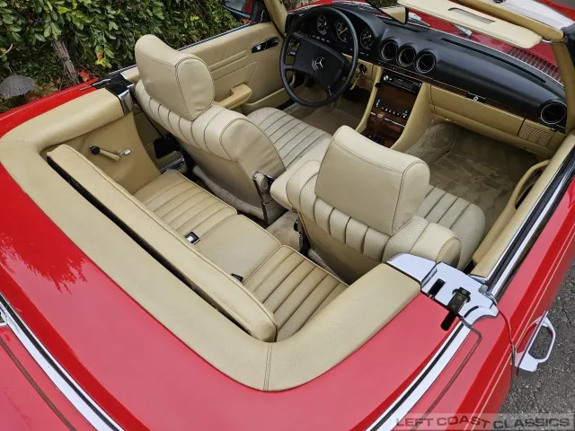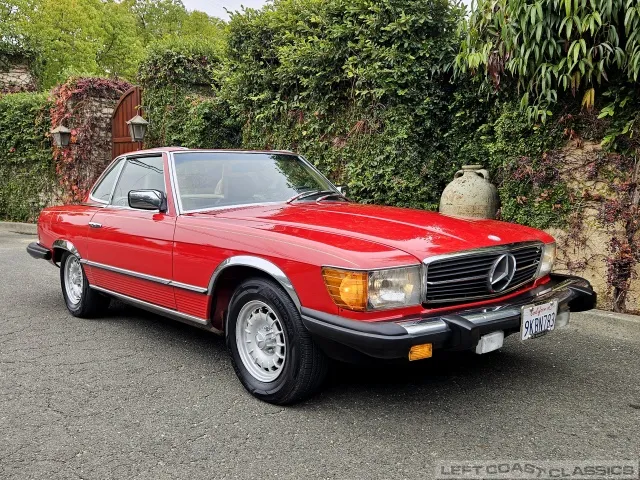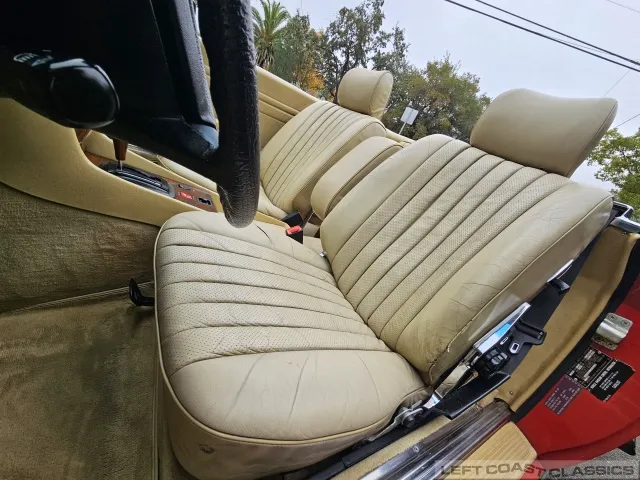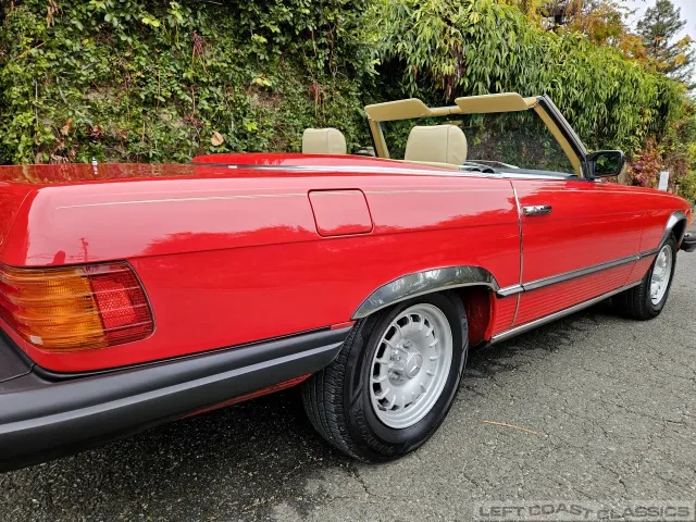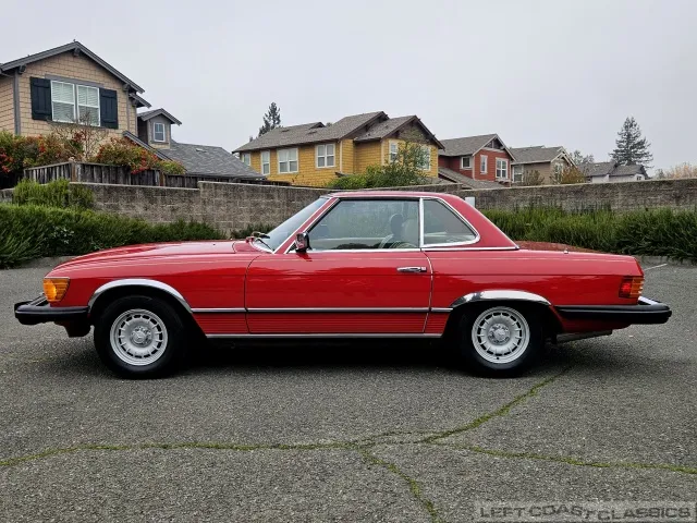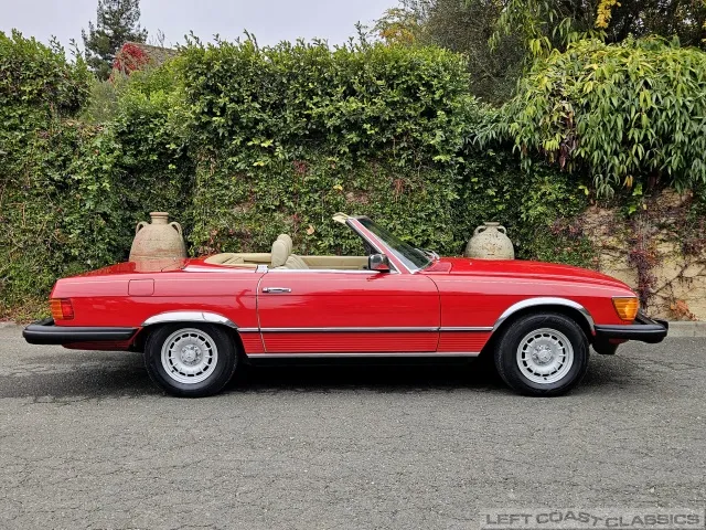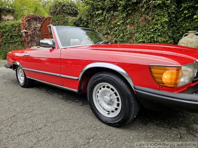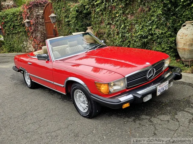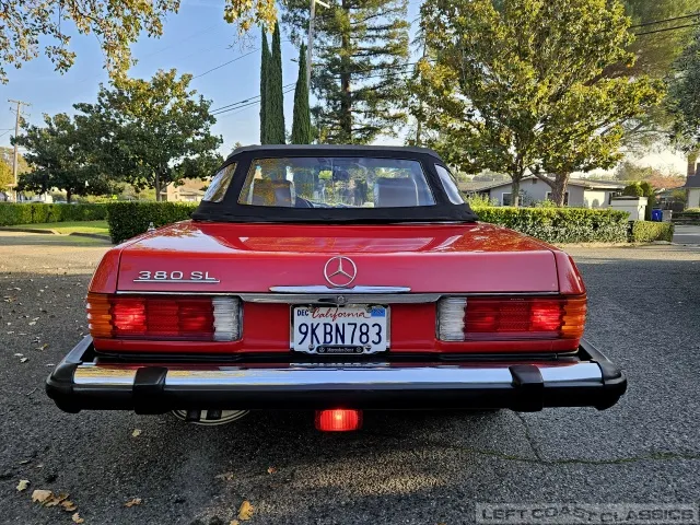 Built in July of 1983 at Mercedes-Benz's Sindelfingen factory and finished new in Signal Red with a Palomino interior. This U.S.-specification 380SL is a later build, benefiting from timing-chain improvements, more refined emissions and drivability tuning, and incremental suspension updates that make them smoother and tighter cars than early examples.