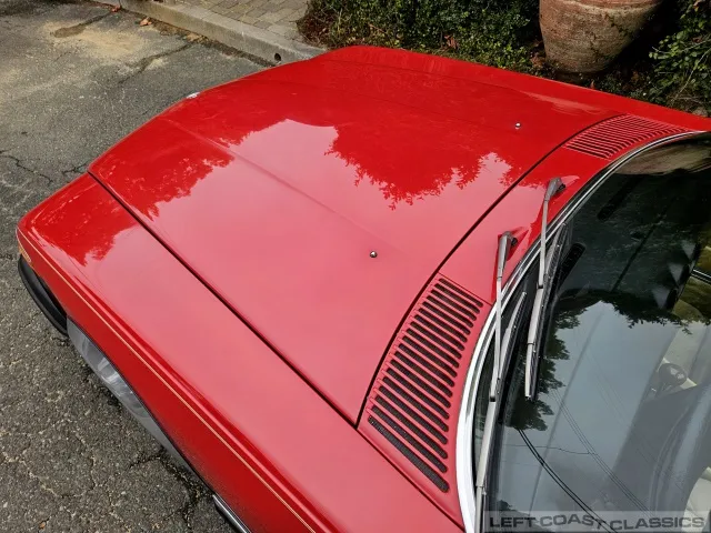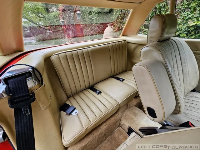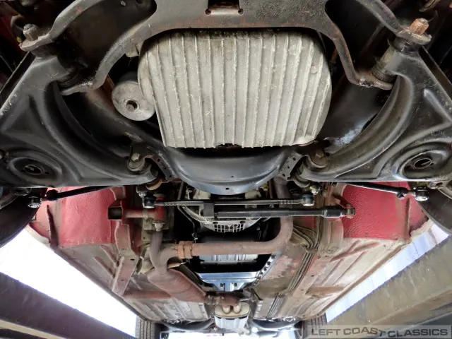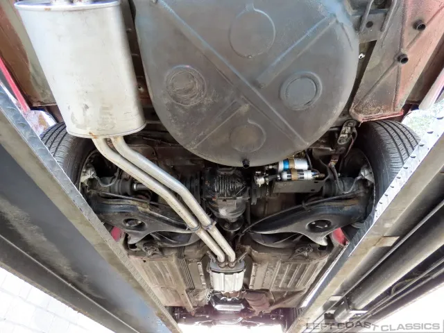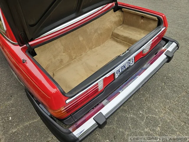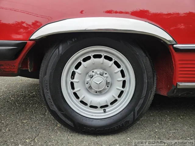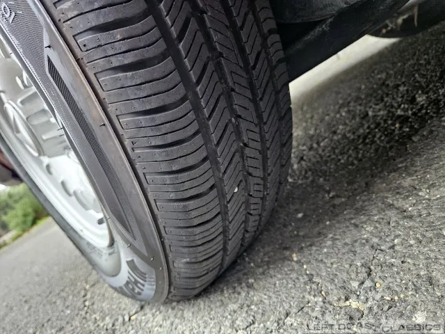 The exterior presents well in its factory color, Signal Red. Brightwork and trim show nicely, glass is in good condition, and the car retains its original 14-inch wheels. The undercarriage is notably clean and dry, with no evidence of rust. The car is equipped with Hankook 205/70 R14 tires, dated 5/19, with 85% tread remaining. The trunk is clean and complete with the spare tire and jack in place.