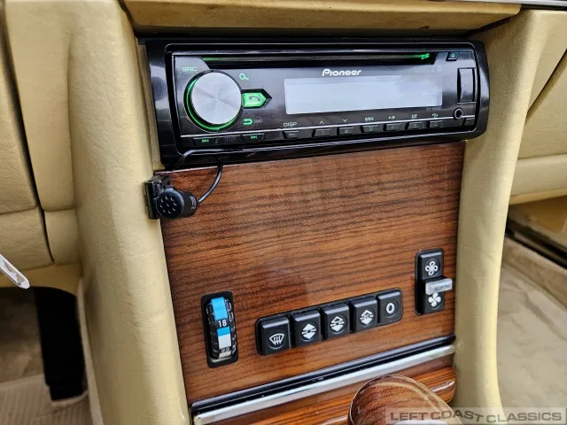 Inside, the cabin presents as an honest, driver-quality interior. The seats show wear consistent with age. The wood trim is in nice condition, the door panels and carpets present well, and the headliner is clean. All gauges are clear and functioning properly, switches operate as intended, and the car is fitted with an AM/FM/CD stereo with Bluetooth, allowing modern connectivity while retaining a period-appropriate appearance. The factory air conditioning is in working order.