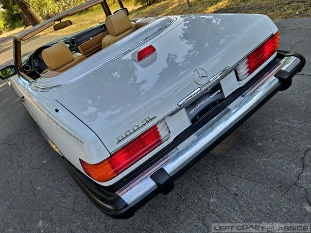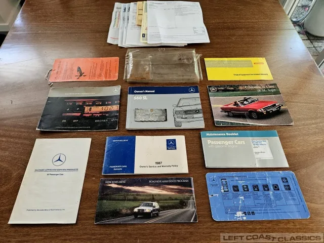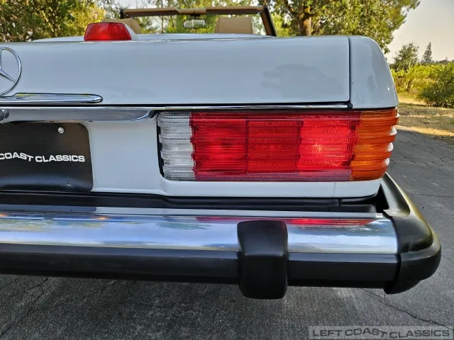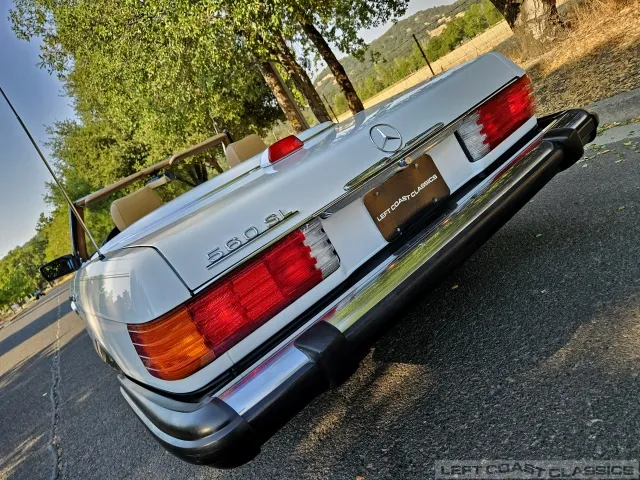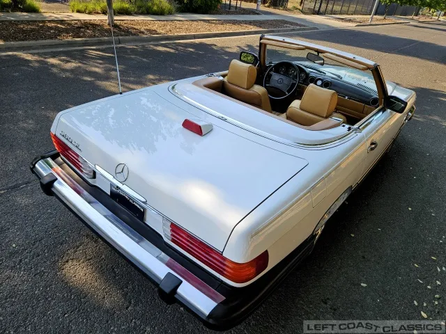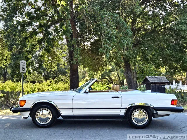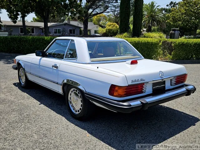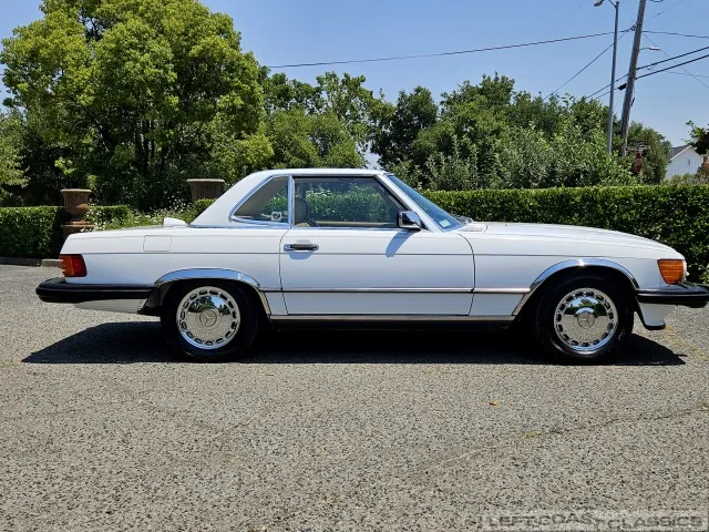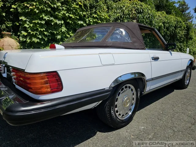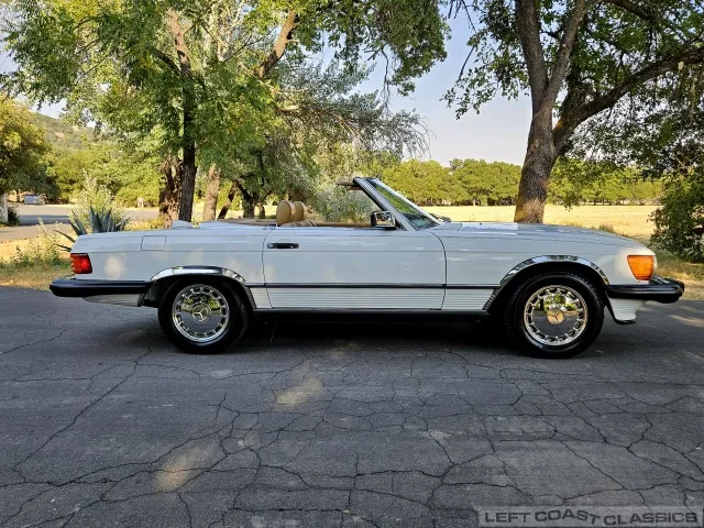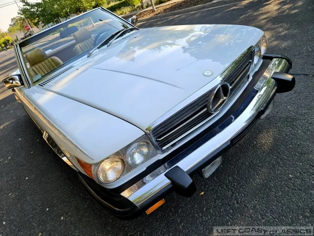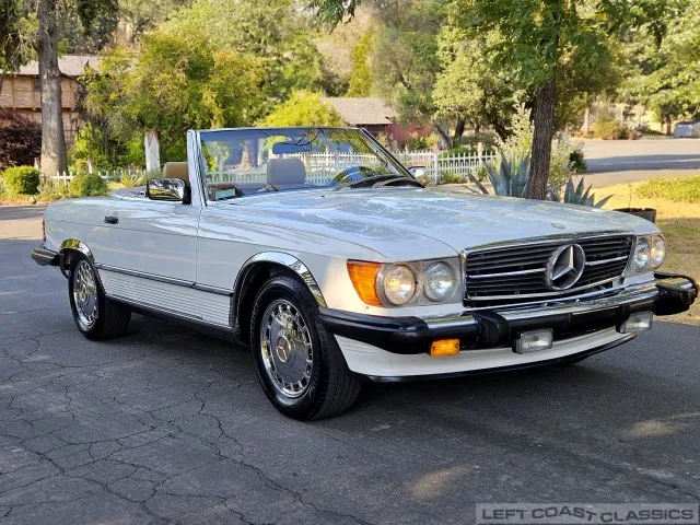 For sale is a striking 1987 Mercedes-Benz 560SL, a true California classic purchased new in September 1987 from Stead Motors in Walnut Creek. Finished in Arctic White with a warm Palomino interior and a dark brown convertible top. It comes with books, manuals, the original data card, and the factory removable hardtop.