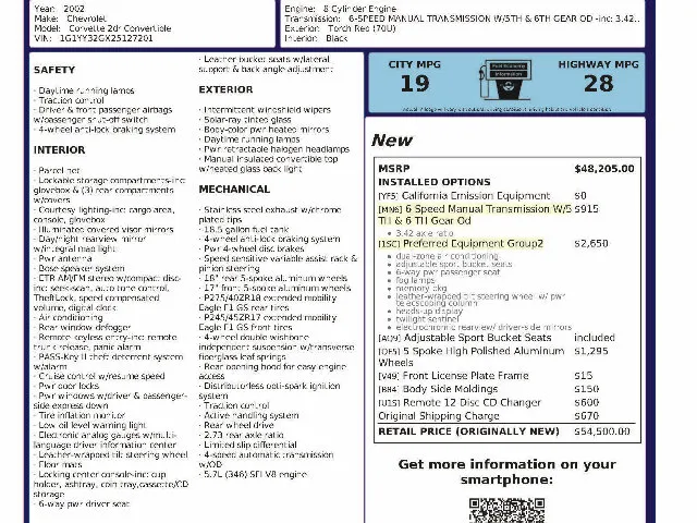 This exceptionally clean, one-owner 2002 Chevrolet Corvette Convertible was purchased new at the local Chevrolet dealership in Sonoma, California, and has remained here ever since. Driven sparingly—just 1,650 miles per year on average—it’s been garage-kept, dealer-serviced, and clearly pampered throughout its life.