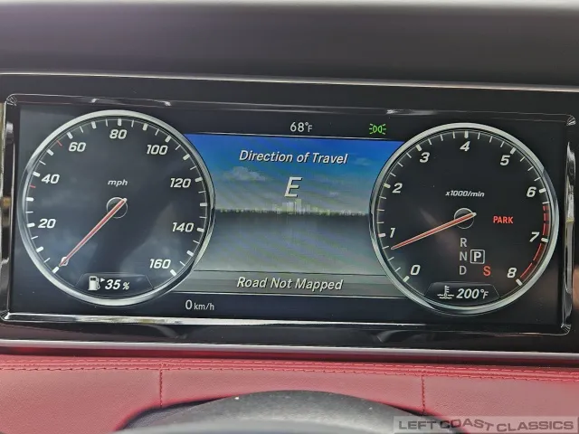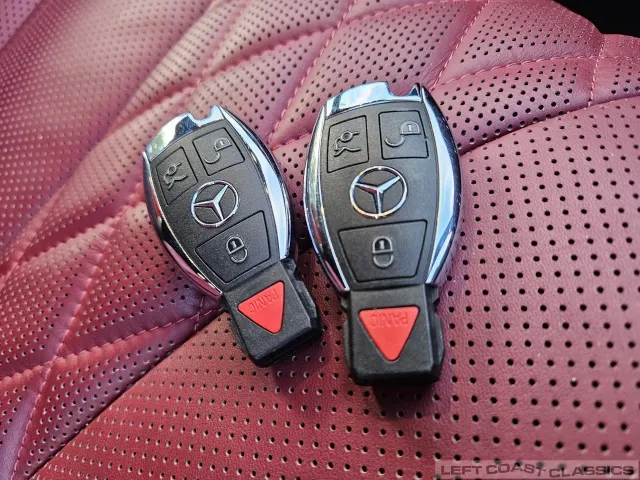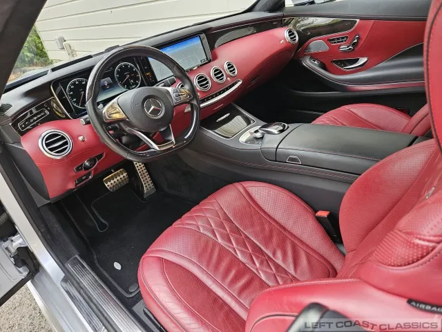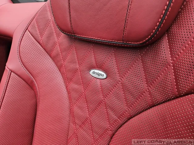 Inside, the cabin is a masterpiece finished in designo Bengal Red/Black Exclusive Nappa Leather. The deep, dark red upholstery wraps the seats, doors, and dash in hand-stitched leather contrasted by black accents, polished metal trim, a Dinamica headliner, and fine wood veneers—creating an atmosphere of warmth and sophistication.
